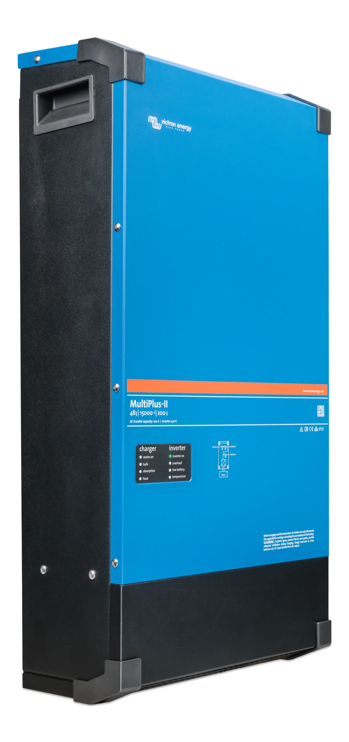The MultiPlus-II 48/15000/200-100 is a high-capacity 15 kVA/12 kW inverter-charger for 48 V systems, offering powerful surge capability and a 200 A charger for demanding installations. Designed for large-scale off-grid or hybrid installations, this model delivers robust full-spectrum functionality — inverter, charger, transfer switch and system monitoring — in one package.