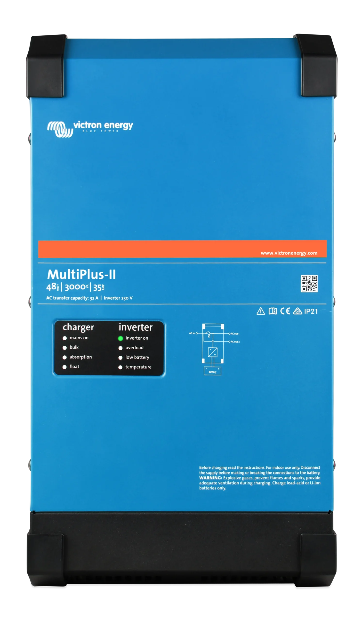The Victron MultiPlus-II 48/3000/35-32 230V is a 3 kVA inverter/charger with a 48 V, 35 A multi-stage battery charger and PowerAssist technology, delivering reliable AC power and intelligent battery management for off-grid, mobile, and backup systems.